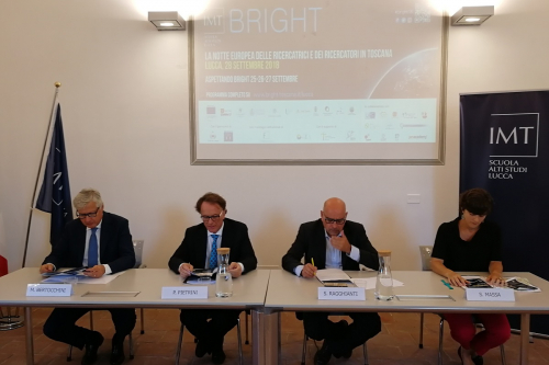 Il programma lucchese di “Bright – La notte dei ricercatori e delle ricercatrici in Toscana” è stato presentato questa mattina (24 settembre) dal professor Pietro Pietrini, direttore della Scuola IMT e da Marcello Bertocchini, presidente di Flafr (la Fondazione Lucchese per l’Alta Formazione e la Ricerca), insieme all'assessore alla cultura del Comune di Lucca, Stefano Ragghianti.Al tavoloanche Silvia Massa, dottoranda in Analisi e Gestione del Patrimonio Culturale alla Scuola IMT.